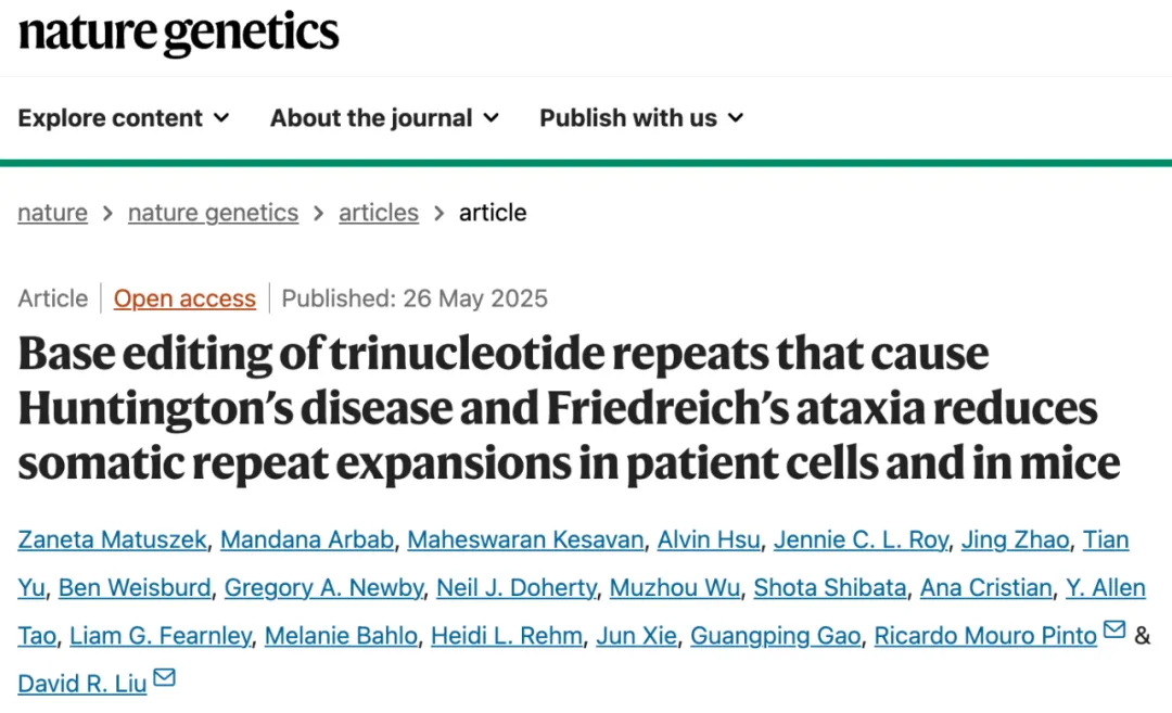 2025 年5月26日,刘如谦教授团队在Nature 子刊 Nature Genetics 上发表了题为:Base editing of trinucleotide repeats that cause Huntington’s disease and Friedreich’s ataxia reduces somatic repeat expansions in patient cells and in mice的研究论文。