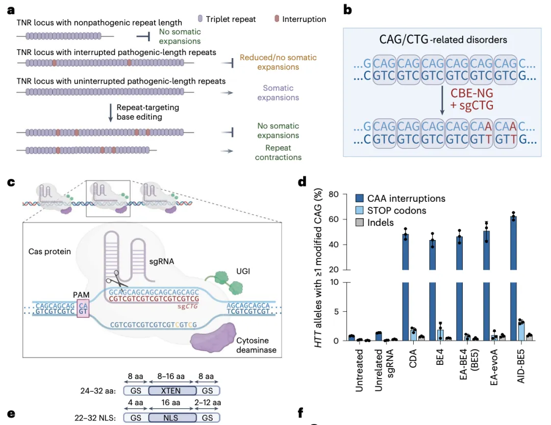 碱基编辑(base editing)是刘如谦教授发明的一种精准的基因组编辑技术,能够直接在活细胞的 DNA 中引入有针对性的单个碱基的改变。其中,胞嘧啶碱基编辑器(CBE)可介导 C•G > T•A 的替换,腺嘌呤碱基编辑器(ABE)可介导 A•T > G•C 的替换,理论上,这两种编辑器能够引入单碱基替换,从而中断三核苷酸重复序列(TNR)等位基因中的重复序列,类似于在普通人群或具有长重复序列但症状轻微或未受影响的个体中发现的中断情况。