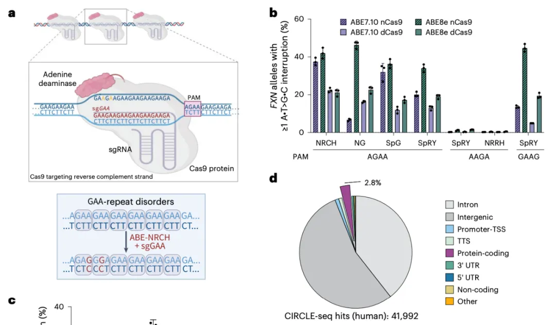 该研究利用碱基编辑技术对三核苷酸重复(TNR)进行单碱基编辑,以中断其重复,在减少亨廷顿病(CAG 重复)和弗里德赖希共济失调(GAA 重复)中的体细胞重复序列扩增方面展现出希望,为治疗这两种疾病提供了潜在新策略。