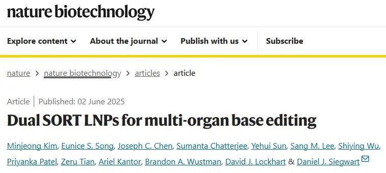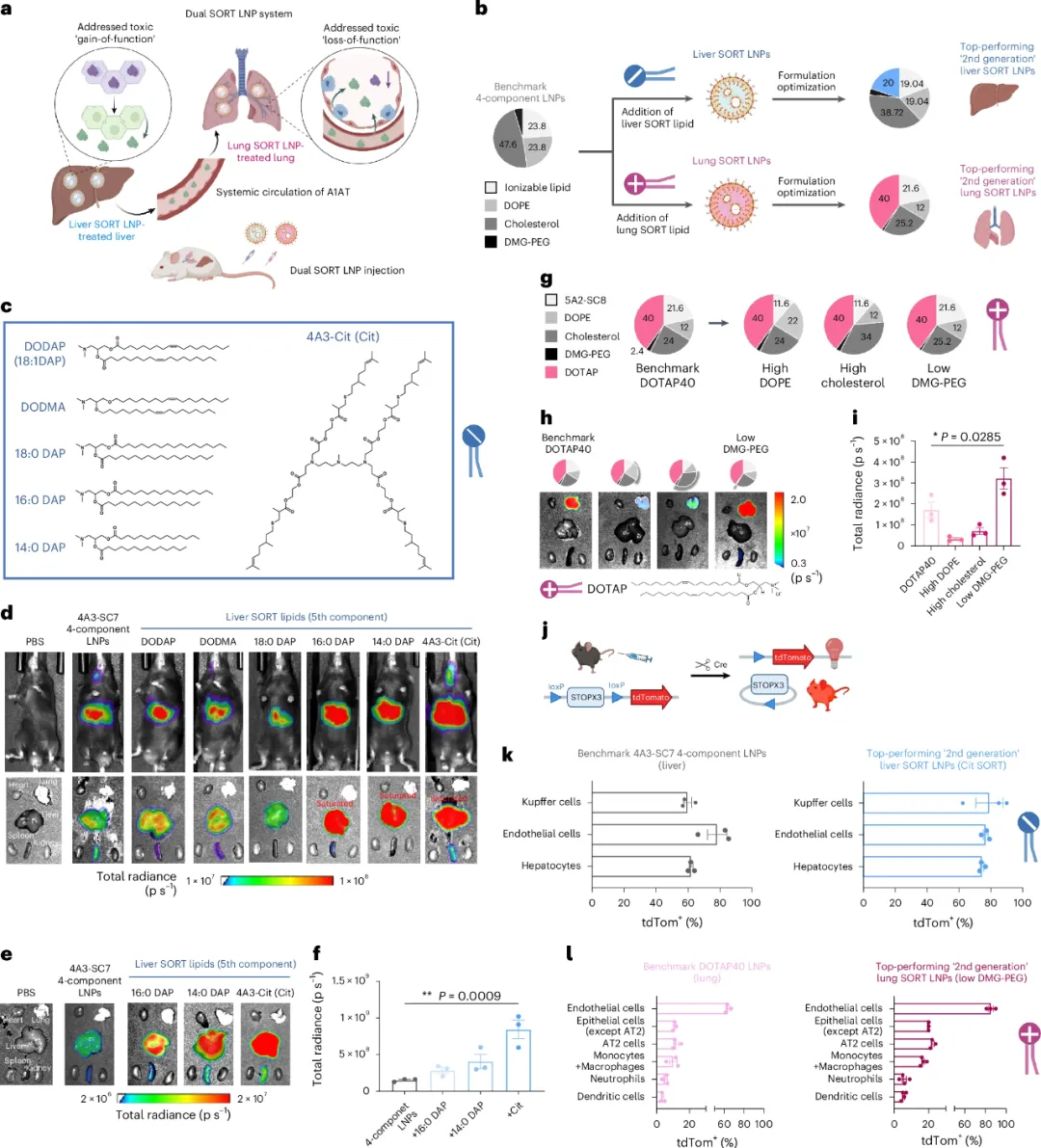 脂质纳米颗粒(LNPs)是目前最先进的RNA治疗药物递送系统,已被用于递送小干扰RNA(siRNA)、信使RNA(mRNA)和基因组编辑器。德克萨斯大学西南医学中心Daniel J. Siegwart团队开发了双重选择性器官靶向脂质纳米颗粒(Dual SORT LNPs),用于将碱基编辑器递送到肝脏和肺部。通过优化LNPs的配方,作者在小鼠模型中验证了Dual SORT LNPs的递送效率和基因编辑效果,包括对肝脏和肺部特定细胞类型的编辑效率,以及对A1AT蛋白水平和中性粒细胞弹性蛋白酶活性的影响。相关内容以“Dual SORT LNPs for multi-organ base editing”为题发表在《Nature Biotechnology》上。