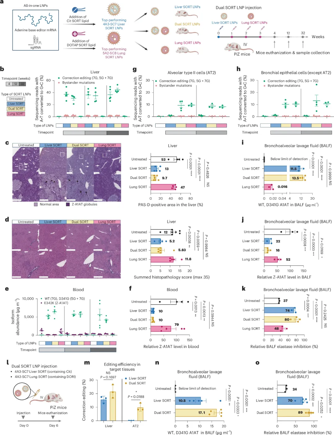 Dual SORT LNPs为AATD等多器官疾病的长期基因组纠正提供了一种有前景的治疗方法。该系统能够同时纠正肝脏和肺部的SERPINA1基因突变,减少Z-A1AT蛋白的积累,并恢复功能性A1AT蛋白的表达,从而抑制中性粒细胞弹性蛋白酶的活性。此外,Dual SORT LNPs在小鼠模型中显示出良好的安全性和耐受性,没有引起明显的器官毒性。这些发现强调了创新递送策略在推进基因编辑治疗复杂遗传性疾病中的重要性,并为未来的临床应用提供了科学依据。