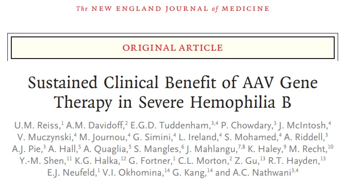2025年6月12日,伦敦大学学院(University College London)Amit C. Nathwani教授团队在The New England Journal of Medicine发表标题为“Sustained Clinical Benefit of AAV Gene Therapy in Severe Hemophilia B”的研究论文,该研究主要对10名接受scAAV2/8-LP1-hFIXco基因治疗的严重血友病B患者进行了长达13年的随访,评估了治疗的安全性和疗效,结果显示单次给药后因子IX表达持久稳定,临床出血率和因子IX浓缩物使用显著降低,且未出现迟发性安全问题,证实了AAV基因治疗的长期有效性和安全性。