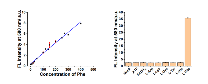 图5  传感平台对苯丙氨酸浓度的荧光响应(左)与传感平台对不同物种的荧光活性的线性关系图(λex=540 nm)[7]