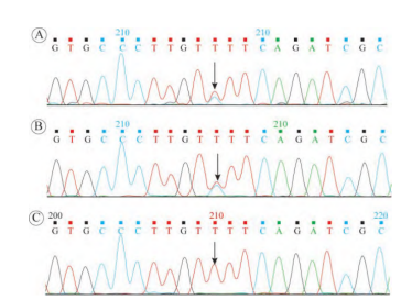 A:患儿F294S电泳结果:Exon8 c.881T>C, p.F294S,杂合突变;B:患儿父亲相同位点一代验证电泳结果:Exon8 c.881T>C, p.F294s,杂合突变;C:患儿母亲相同位点一代验证电泳结果,为野生型[3]