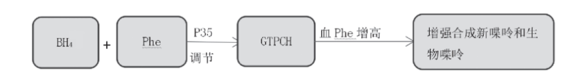 生成的BH4会与Phe通过一种GTPCH刺激蛋白 (P35) 起着调节GTPCH的作用,当血Phe增高时,通过增强GTPCH作用促进新喋呤和生物喋呤的合成 (如图4)[1]。