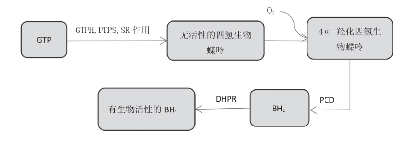 三磷酸鸟苷 (GTP) 在三种合成酶作用下,合成无活性的四氢生物蝶呤,后者与氧气结合生成4α-羟化四氢生物蝶呤,然后在翼素-4α-卡宾明脱水酶 (PCD) 作用后生成 (二氢生物蝶呤) BH2,再在二氢生物喋呤还原酶 (DHPR) 作用下,生成具有生物活性的BH4,发挥重要的生理作用 (如图3)。