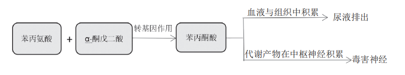 而PKU患者由于缺乏苯丙氨酸羟化酶,使得苯丙氨酸不能羟化为酪氨酸,所以遵循另一条代谢通路,即苯丙氨酸 (Phe) 与α-酮戊二酸进行转氨基作用,生成苯丙酮酸,引发大量的苯丙酮酸在血液和组织中堆积,最后于尿液中排出。而苯丙酮酸的代谢产物在中枢神经积累并产生毒性,会导致相应的神经系统症状(如图2)。