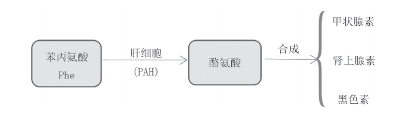 正常情况下,苯丙氨酸是通过肝细胞产生的苯丙氨酸羟化酶 (PAH) 转化为酪氨酸,之后再分别合成甲状腺素,肾上腺素和黑色素等途径来完成代谢(如图1)。