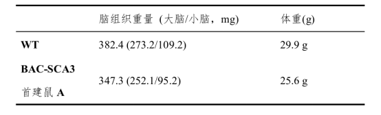 表1 月龄BAC-SCA3首建小鼠与野生型小鼠体重及脑组织重量的比较[2]