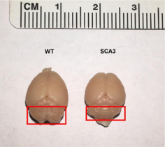 后来又有团队用细菌人工染色体 (Bacteria artificial chromosome, BAC) 构建SCA3BAC转基因小鼠模型,带有全长的人突变ATXN3基因,包括全部外显子、内含子,以及上游的启动子和其他调控元件。在BAC-SCA3首建鼠到达7个月月龄时,它的全脑组织进行重量检测和免疫荧光检测。BAC-SCA3雄性首建鼠A的体重和脑组织重量都比同笼同月龄的雌鼠小,说明该首建鼠出现了严重的体重下降和脑萎缩。红色方框里面显示的是小鼠的小脑组织;在免疫荧光检测结果可以看出BAC-SCA3小鼠在7个月时,与野生型小鼠相比,小脑、脑干和海马皮层有显著的ATXN3蛋白聚集现象,以小脑更为显著,然而在大脑皮层和基底节并未检测到明显的ATXN3。SCA3患者受累脑区也以小脑和脑干为主,皮层和基底节受累较少。该结果说明BAC-SCA3小鼠的受累脑区和SCA3患者的受累脑区较为一致[2]。