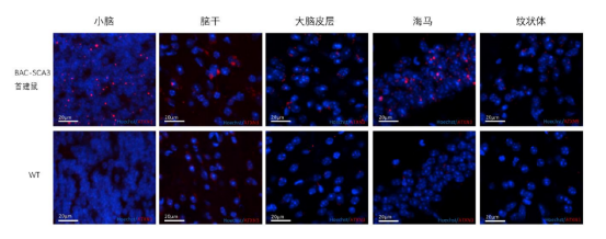 蓝色荧光为细胞核染色,红色荧光为ATXN3蛋白。上为BAC-SCA首建鼠A,下组为野生型小鼠[2]