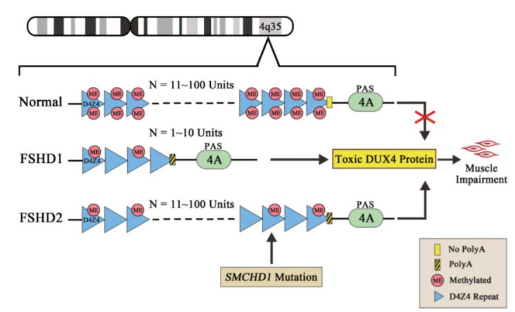 健康人的4号染色体长臂亚端粒区(4q35)上的等位基因D4Z4上有11-100个重复单元。占患者数量95%FSHD1是由于D4Z4重复少于10,从而导致DUX4基因的甲基化程度降低以及抑制性异染色质的减少,染色质结构的开放允许D4Z4重复序列中的致病基因DUX4被转录而持续表达DUX4的异常表达导致肌细胞调亡、氧化应激、干扰肌源性分化和诱导萎缩性肌管的形成,引起肌肉损伤。D4Z4重复数量越少则疾病越严重[1]