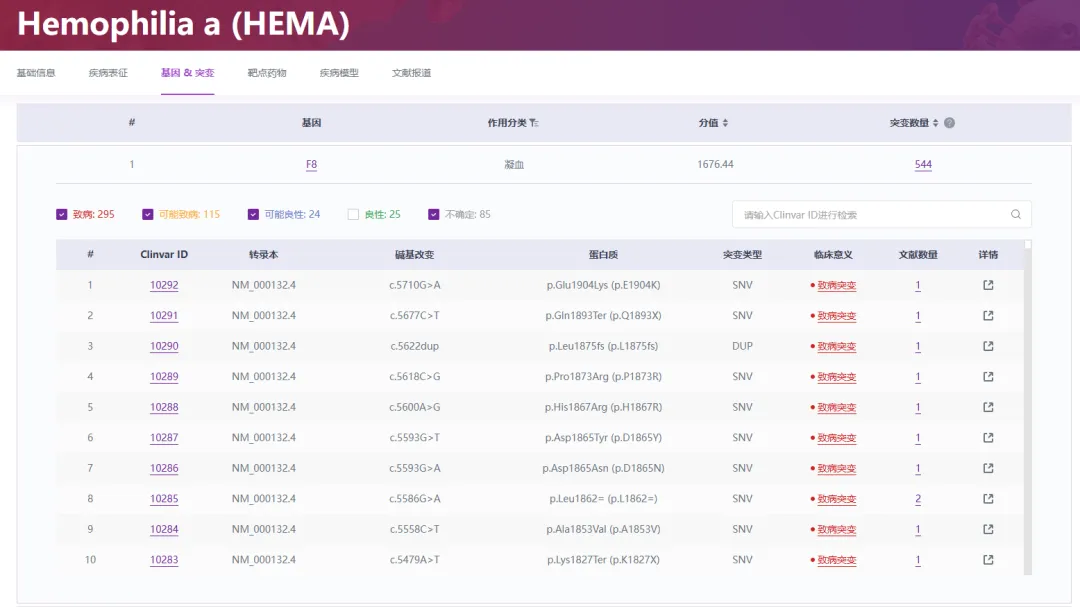⭐️与血友病A的关系:血友病A是一种遗传性疾病,主要影响男性,因为F8基因位于X染色体上。罕见病数据中心(简称“RDDC”,网址:https://rddc.tsinghua-gd.org/)收录了血友病A与F8基因突变的关系(图4)。数据显示,F8基因有544种突变可能导致或影响血友病A的发生。这些突变包括内含子22倒位、点突变、缺失或异常基因插入等[5,6]。这些突变会导致凝血因子VIII的合成障碍或功能异常,进而引发血友病A。