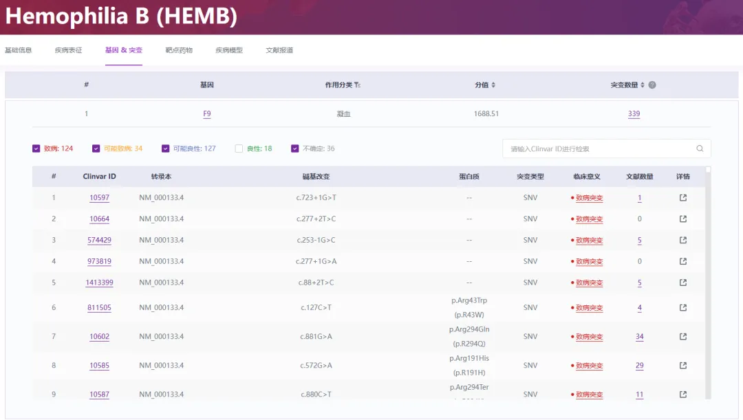 ⭐️与血友病B的关系:根据RDDC数据库的记录,血友病B与F9基因的突变有着密切的关系(图5)。目前已知,F9基因有339种不同的突变形式可能会导致或增加血友病B的风险。这些突变类型包括缺失、插入和点突变等[7,8]。当F9基因发生突变时,可能会导致凝血因子IX的合成减少或其功能出现异常,从而引发血友病B。
