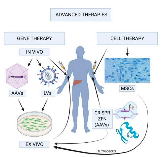 图6展示了血友病的基因治疗策略,主要分为体内基因治疗和体外基因治疗两大类:体内基因治疗涉及将含有“治疗基因”的载体,例如腺相关病毒(AAV)或慢病毒(LV),通过全身性的注射方式输送到患者体内。这种方法直接在患者体内实施,旨在通过引入功能性基因来纠正遗传缺陷,从而治疗疾病。相比之下,体外基因治疗则首先需要在体外环境中对自体或同种异体细胞进行转染操作,这些经过基因修饰的细胞在培养基中扩增后,再被输回至患者体内。此方法的优势在于可以对细胞进行精确的基因编辑,并在控制的环境中验证其安全性和有效性之后,再将其应用于患者。这两种策略都旨在通过基因层面的干预,为血友病患者提供更为精准和持久的治疗效果。通过选择合适的策略,可以为患者提供个性化的治疗方案,以达到最佳的治疗效果。