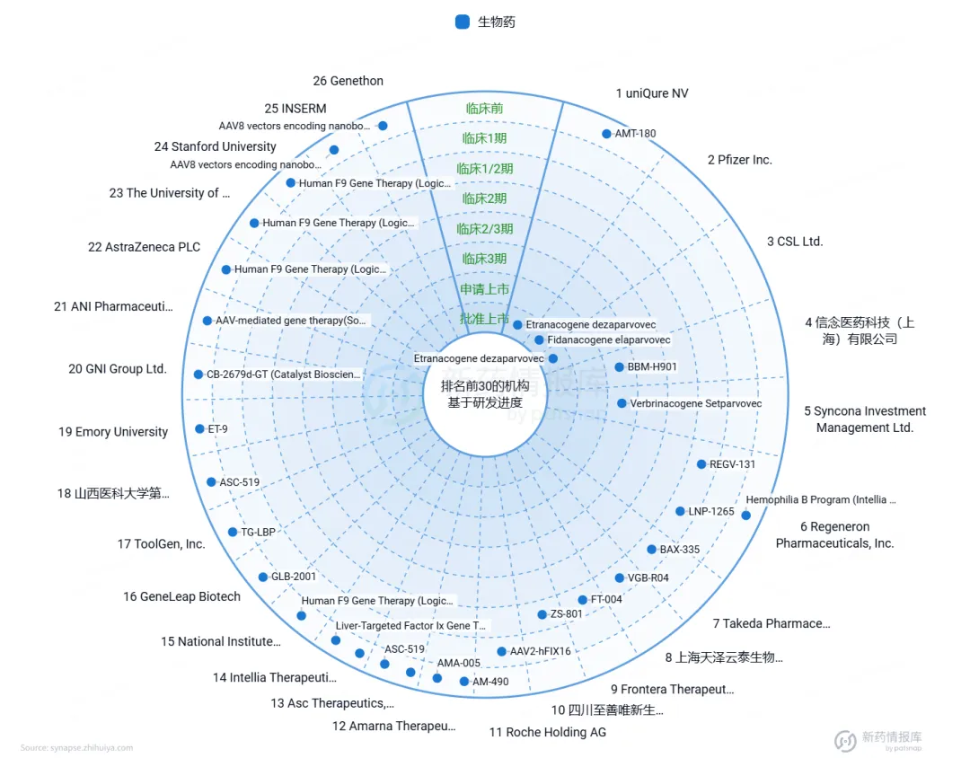 根据智慧芽新药情报库上的统计资料,血友病A和血友病B的基因治疗药物研发领域正经历着显著的发展。在医学科技不断进步的今天,针对血友病B的F9基因,已有Etranacogene dezaparvovec和Fidanacogene elaparvovec药物获批上市(图7)。