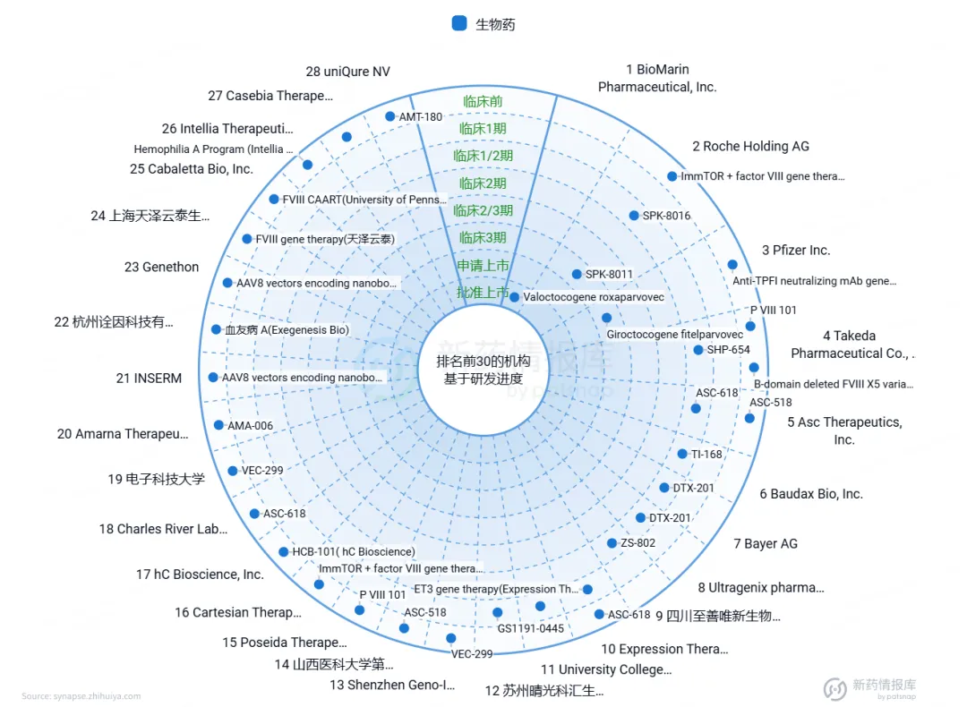 此外,还有近60种基因治疗药物正处于临床或临床前试验阶段。这些潜在疗法的研发背后,是来自全球各地制药企业的共同努力。其中,Pfizer、BioMarin等全球知名的制药企业赫然在列,他们凭借雄厚的科研实力,为血友病的治疗贡献了重要的力量。同样值得注意的是,多家中国药企也在积极参与其中,如信念医药科技(上海)有限公司、苏州诺洁贝生物技术有限公司、苏州晴光科汇生物科技有限公司等。他们的参与不仅展现了国内外制药行业对于血友病基因治疗药物开发的高度重视,也体现了中国在全球医药研发领域的活跃参与和贡献。