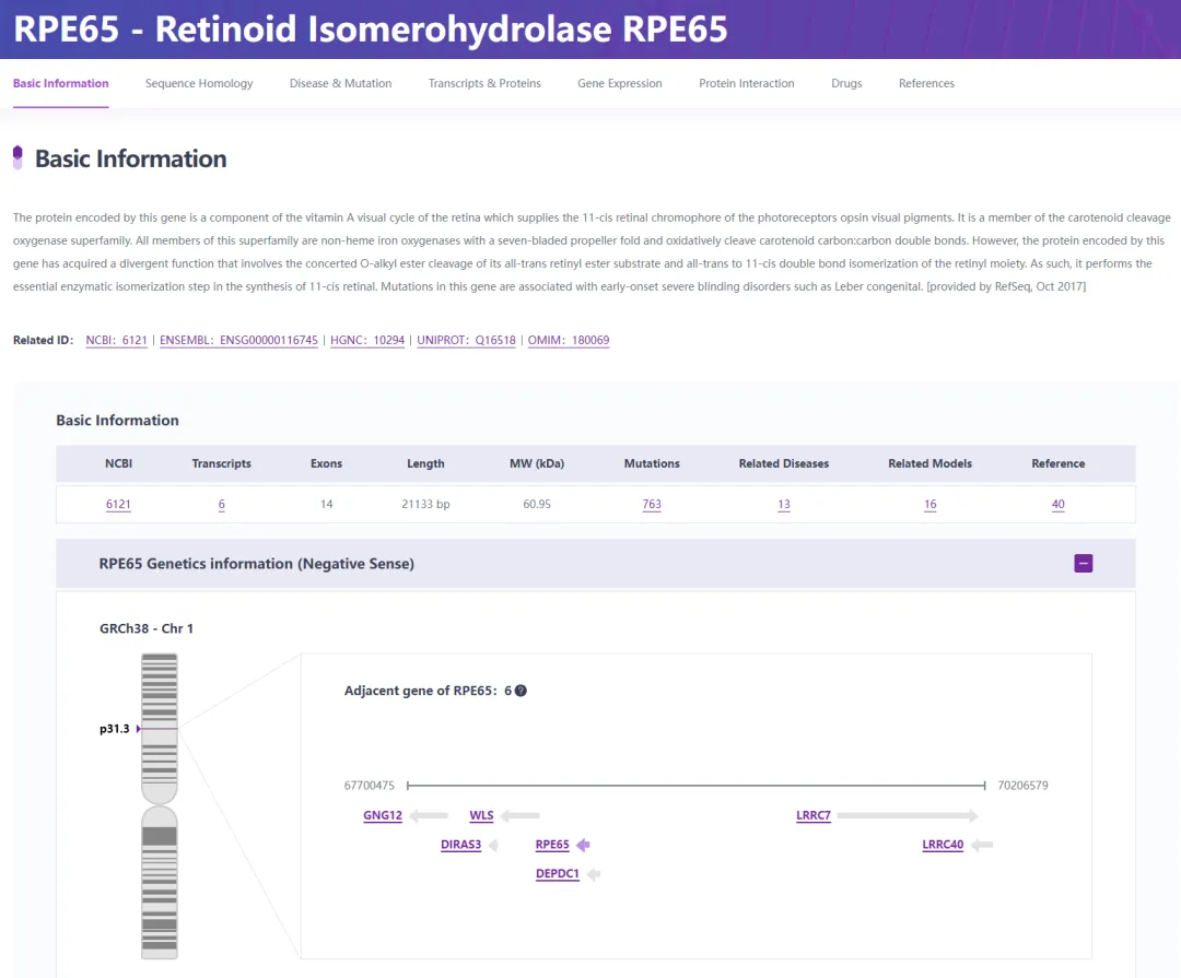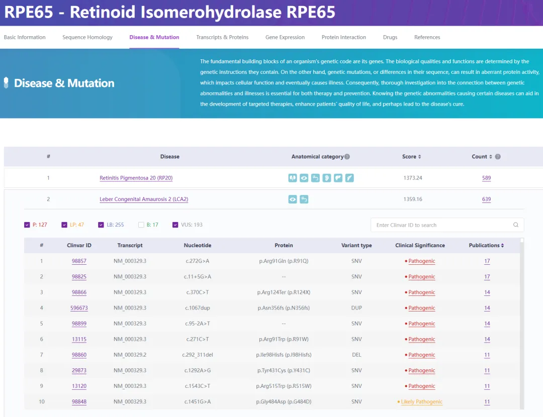 该基因与LCA2最为密切相关,根据RDDC数据库的统计(图4),RPE65基因目前已确认存在639个与LCA2相关的突变,其中127个被认定为致病性突变,这些突变已被广泛研究和报道。