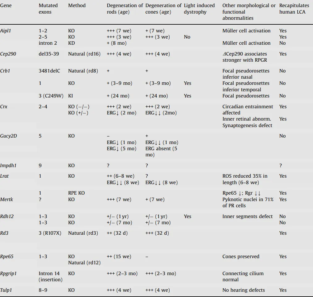 在LCA研究中,小鼠模型更是发挥着举足轻重的作用。由于小鼠在遗传和生理上与人类具有高度相似性,因此小鼠模型能够非常准确地模拟人类LCA患者的基因突变和病理特征。借助现代基因编辑技术,如CRISPR-Cas9,科学家们能够精确地在小鼠身上模拟人类LCA患者的基因突变,并观察这些突变如何影响视网膜的结构和功能。这些小鼠模型不仅展示了与人类LCA患者相似的病理特征,如光感受器细胞的逐渐退化、视觉功能的损失以及视网膜的病变,还为评估潜在的治疗方法提供了实验基础。为了更深入地理解LCA的发病机制和开发潜在的治疗方法,研究人员已经建立了多种小鼠模型来模拟这一疾病(图5)。