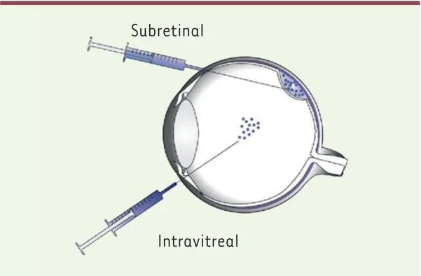 基因增强疗法是LCA潜在治疗的主要来源。已经对常见涉及的基因进行了动物研究,包括GUCY2D、RPE65、AIPL1、RPGRIP1、LCA5、CEP290和RDH12,主要是通过使用腺相关病毒(adeno-associated virus, AAV)载体介导或慢病毒载体介导的基因增强疗法[6],载体的注射途径如图6所示,注射视网膜下或玻璃体内[14]。