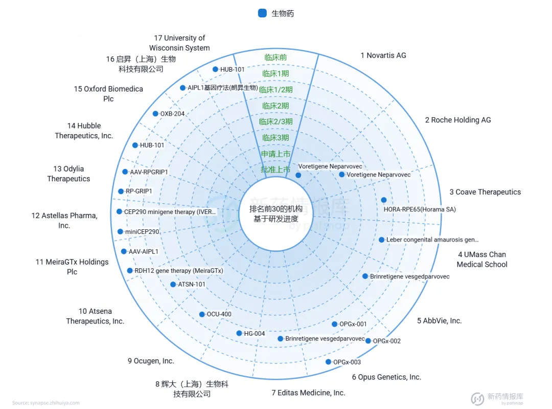 根据智慧芽新药情报库中的LCA基因治疗药物统计(图7)可知:目前,针对RPE65突变的基因治疗已取得显著进展,其中Voreligene Neparvovec已进入上市阶段。此外,针对GUCY2D、RPE65和CEP290的临床试验也正如火如荼地进行中,这些试验旨在进一步验证基因增强疗法在治疗LCA中的有效性和安全性。值得注意的是,多个国家都积极参与到LCA基因治疗药物的研发中。在中国,辉大(上海)生物科技有限公司和启昇(上海)生物科技有限公司等公司也在该领域取得了重要进展。其中,辉大(上海)生物科技有限公司研发的药物已进入临床1/2期试验,而启昇(上海)生物科技有限公司的药物则已进入临床前阶段,这些进展为LCA患者带来了新的治疗选择和希望。
