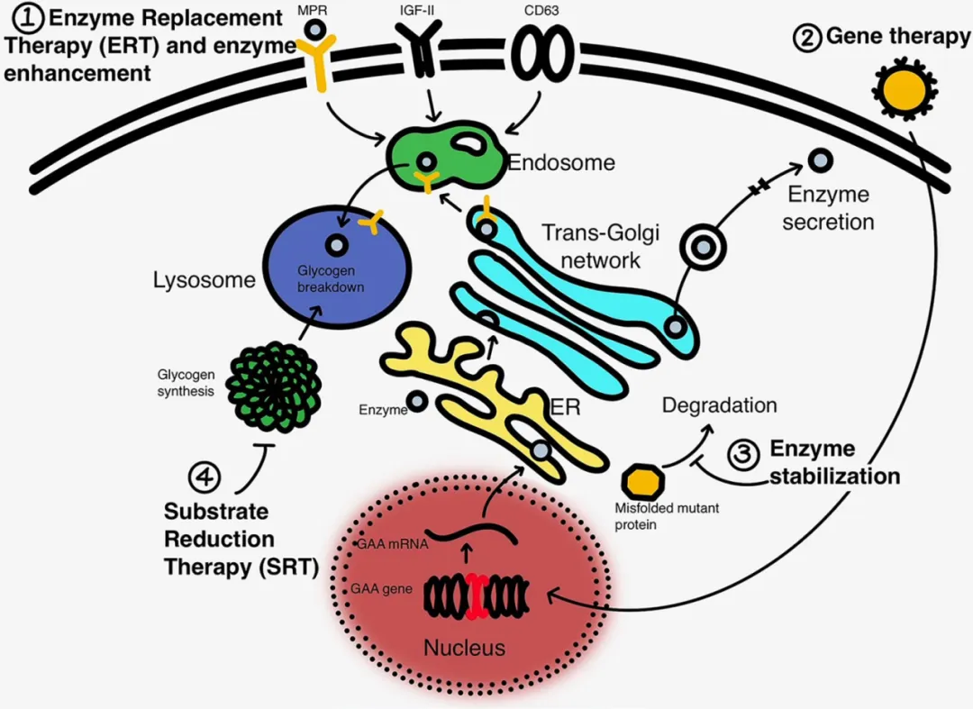 幸运的是,随着医学的进步,庞贝病的治疗已取得突破。酶替代疗法(ERT)是目前主要的治疗手段,通过静脉输注重组人GAA(rhGAA),如阿糖苷酶α(Myozyme®/Lumizyme®),来补充患者体内缺失的酶,延缓疾病进展[3-5]。然而,酶替代疗法并非完美,抗体产生、药物递送效率、对神经系统病变的有限效果以及高昂的治疗费用,都是亟待解决的挑战。因此,全球研究者正积极探索更前沿的治疗策略[6-12]: