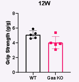与野生型小鼠相比,Gaa KO小鼠肌力测试数值较低。