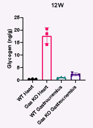 图7 12周龄纯合雌性Gaa KO小鼠和野生型(WT)小鼠的心脏和腓肠肌的糖原含量检测(n=3)